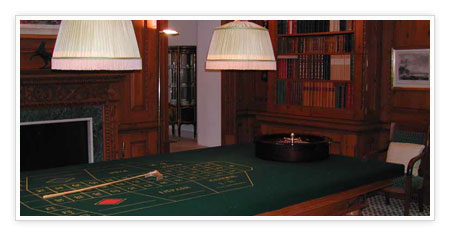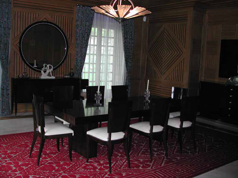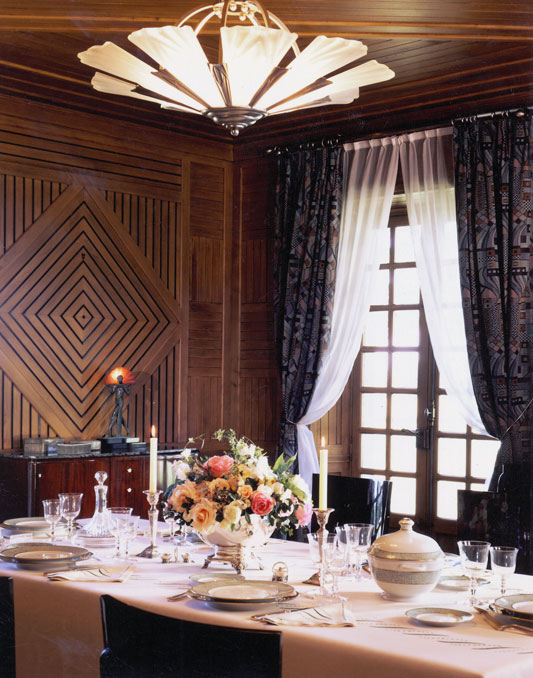 The Dining Room offers a marble floor, oak paneled walls and ceiling, and large concealed cupboards. An equally impressive cocktail bar has a vaulted ceiling and is decorated in the Art Deco style.