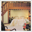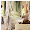 The Master Bedroom features a handsome Georgian-style carved wood mantelpiece with green marble inserts. The walls are fabric covered and there are exposed roof timbers. Windows on both the north-east and south-west sides allow plentiful natural light for a cheerful appearance by day.