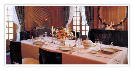 The Dining Room offers a marble floor, oak paneled walls and ceiling, and large concealed cupboards. An equally impressive cocktail bar has a vaulted ceiling and is decorated in the Art Deco style.