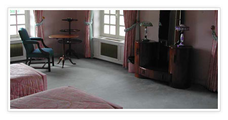 The Master Bedroom features a handsome Georgian-style carved wood mantelpiece with green marble inserts. The walls are fabric covered and there are exposed roof timbers. Windows on both the north-east and south-west sides allow plentiful natural light for a cheerful appearance by day.