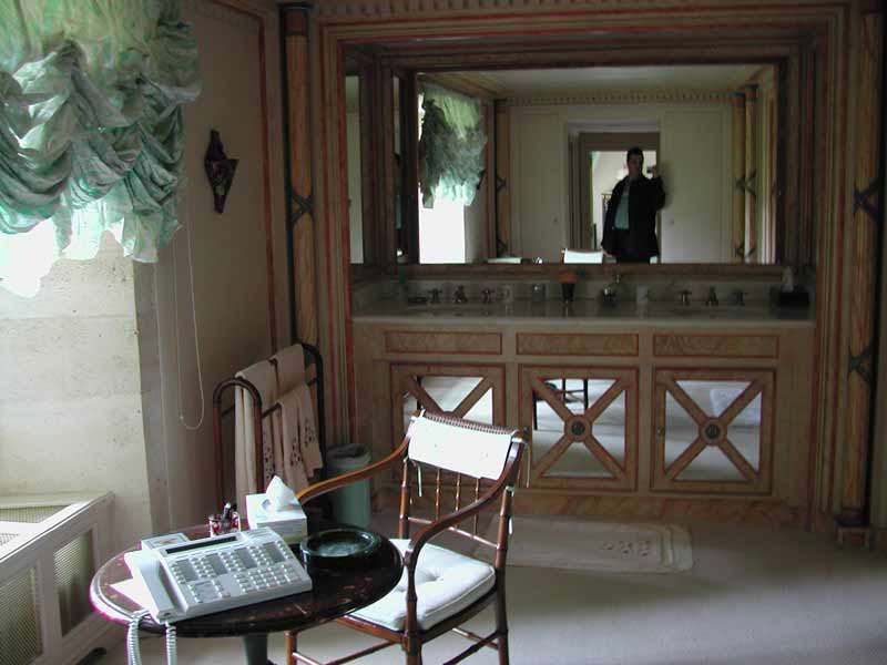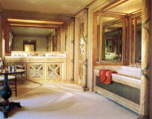 The adjoining bathroom is complete with shower, bidet and WC behind part-mirrored doors. The bath is surrounded by marble and mirrors. A double hand-basin is at the end of the room in the matching decor.
