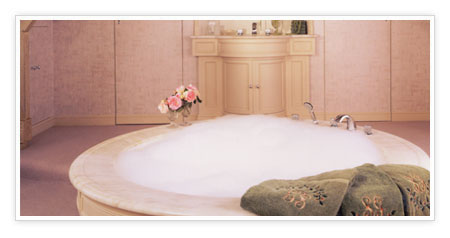 The adjoining bathroom is marked by dormer windows, exposed roof timbers and a large circular marble bath in the center. To the side is circular hand-basin as well as a bidet and WC