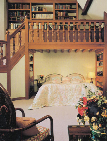 Another bedroom provides a unique sleeping alcove formed by a landing and a balcony. On either side of the bed are fitted bookshelves, while above lies a library gallery in oak with oak banisters and fitted bookshelves. Exposed roof timbers and windows on the north-west and south-east sides create an intriguing place to rest.